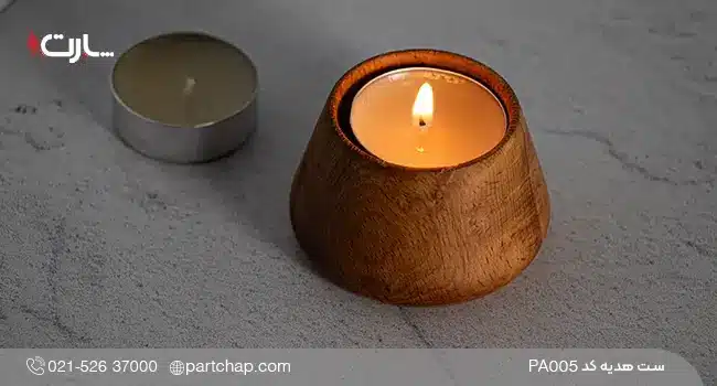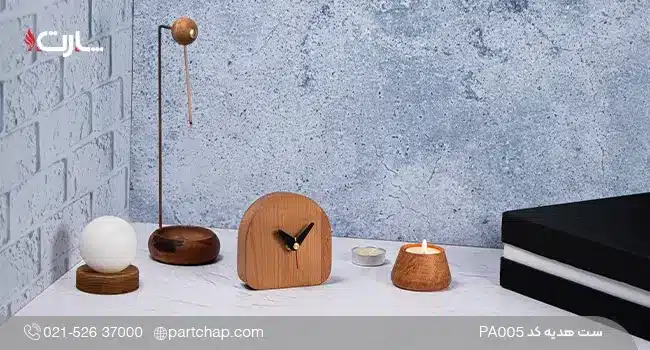 اقلام : ساعت رومیزی چوبی – جاعودی چوبی – عود – جاشمعی چوبی – شمع وارمر – پایه چوبی و سنگ نمک