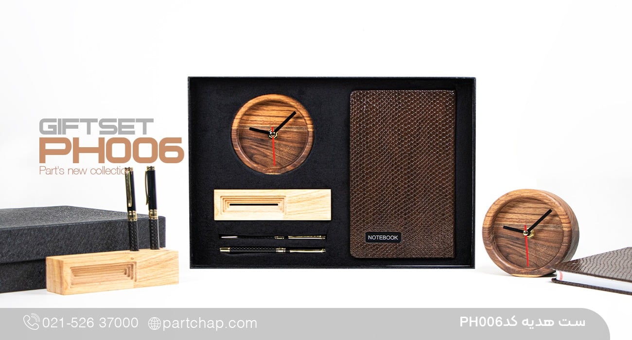 - اقلام : دفتر یادداشت ، ساعت رومیزی ، نظم دهنده چوبی، خودکار و روان نویس