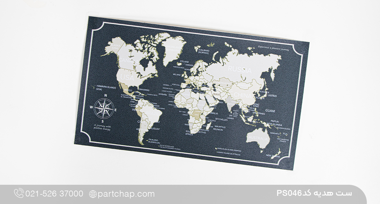 اقلام : جلد پاسپورت ، تگ چمدان ، تراول ماگ ، نقشه چرمی جهان ، اسپیکر ، پاوربانک وایرلس